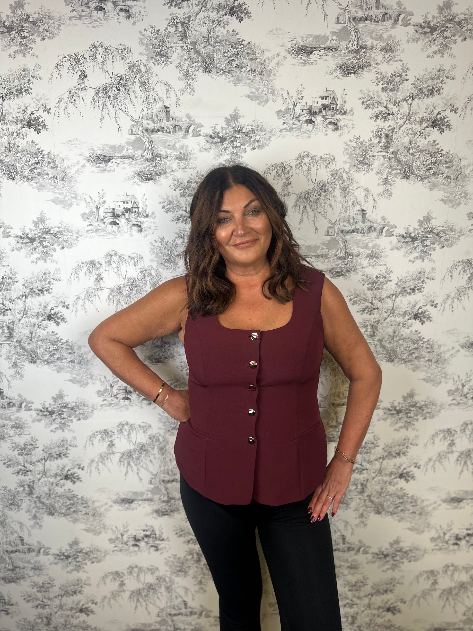 The JAMIE WAISTCOAT by girl in mind is a stylish addition to any wardrobe. The berry colored waistcoat is accented with gold buttons, adding a touch of glamour to any outfit. Made with high-quality materials and designed with precision, this waistcoat is perfect for any occasion, making you stand out in a crowd.