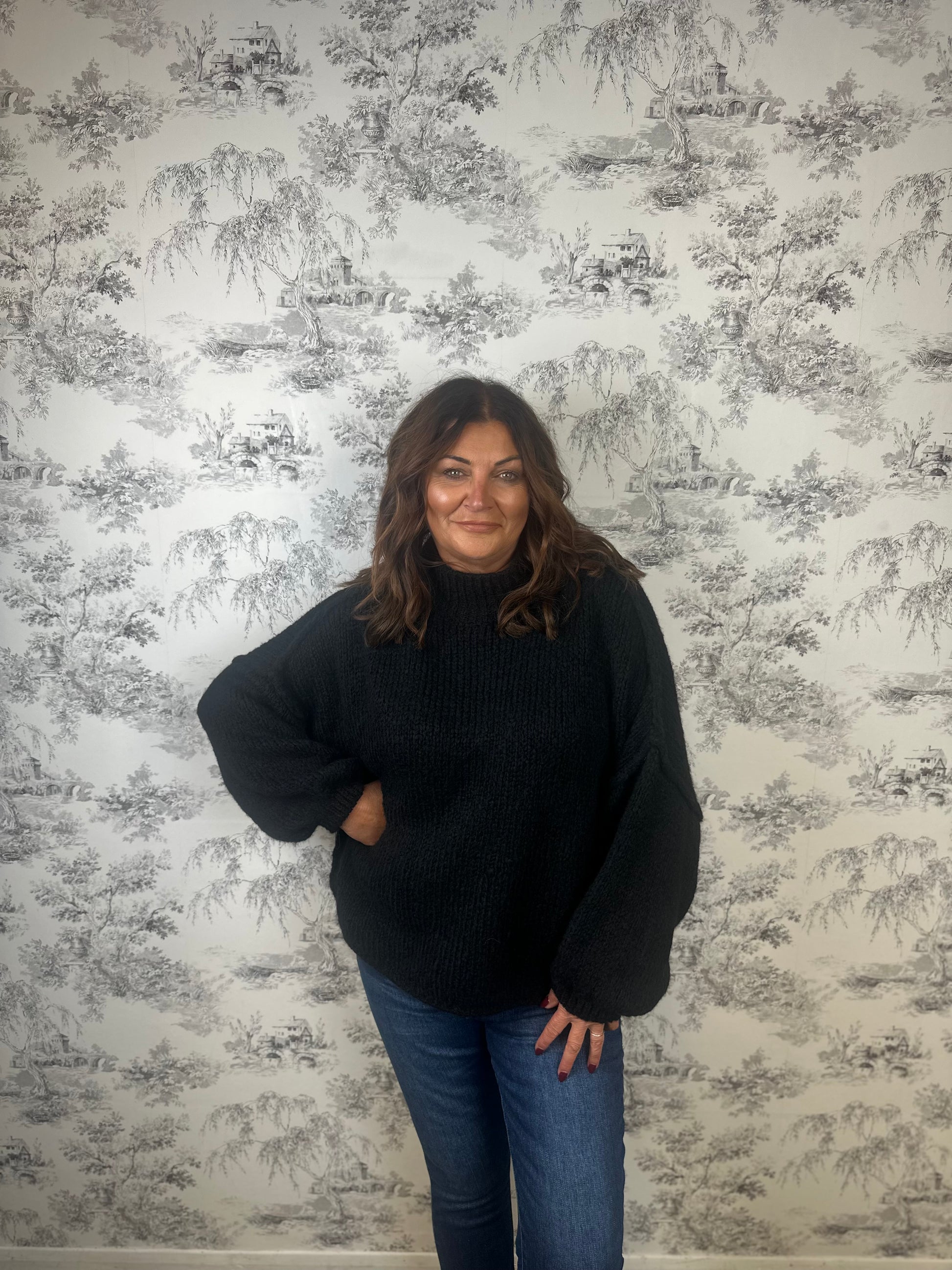 Introducing the LIZZY KNIT - your new go-to for chilly days. This black, thick knit sweater features a high neck for added warmth and a cosy fit. Stay comfortable and stylish with this must-have piece. One Size.