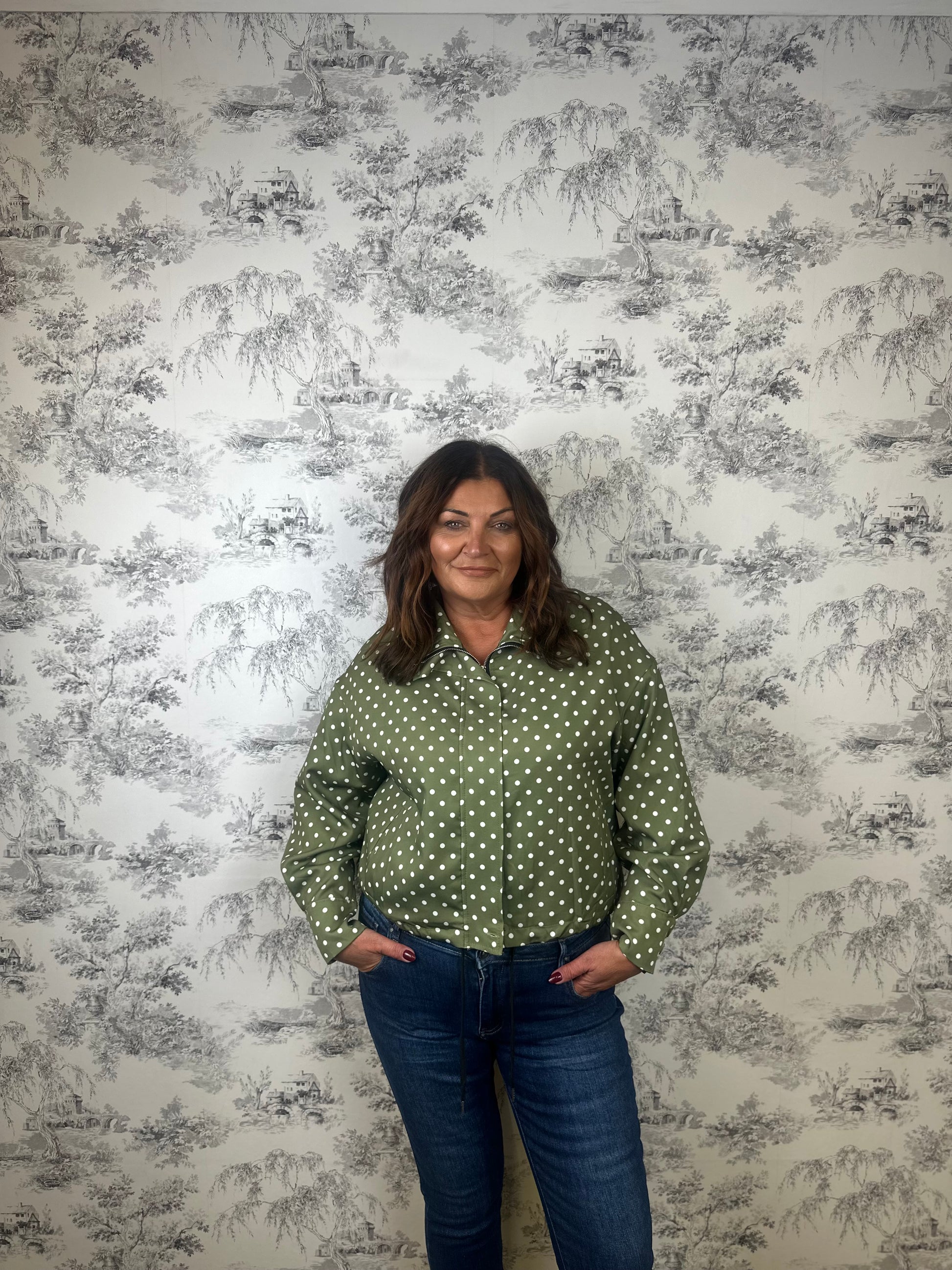 The POSIE JACKET is the perfect addition to your wardrobe for a touch of effortless style. This casual bomber jacket features a trendy green color and playful polka dot pattern, making it a statement piece for any outfit. Stay chic and comfortable with this must-have jacket. One Size.