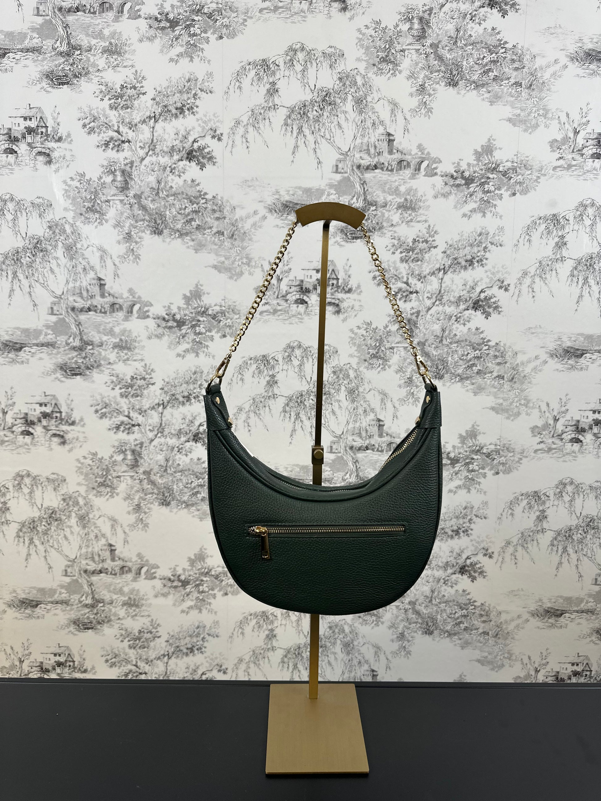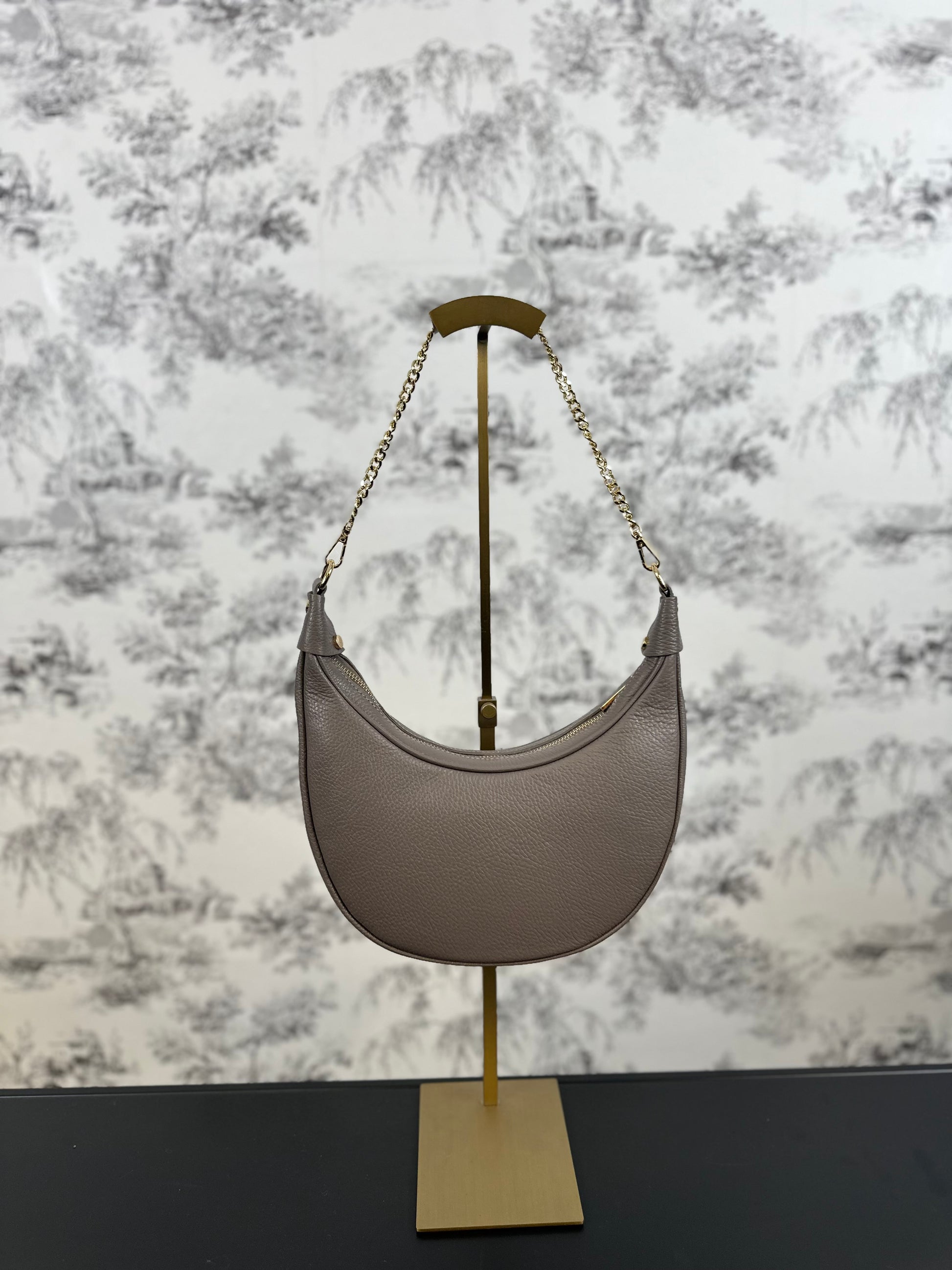 Elevate your style with the SADIE BAG. Crafted from real Italian leather, this half moon styled bag boasts a chic and fashionable appeal. Wear it effortlessly with the chain strap and stand out in every occasion. Upgrade your wardrobe with this stylish and elegant bag. Includes a long strap.