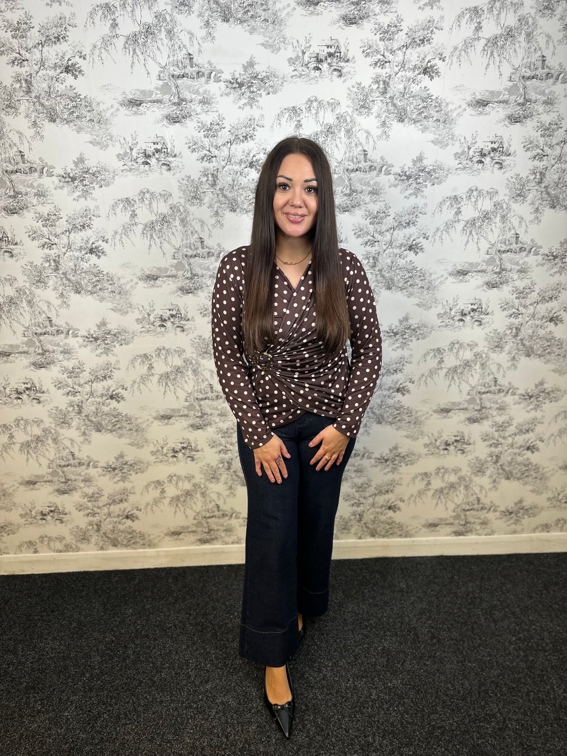 Introducing the DOTTY TOP! Featuring a unique cross front design with a gold clasp, this top creates a flattering wrap-around look. The polkadot material and rich chocolate color make it stylish and comfortable, making it the perfect addition to your wardrobe. Your new go-to for effortless style! One Size - up to a 16.