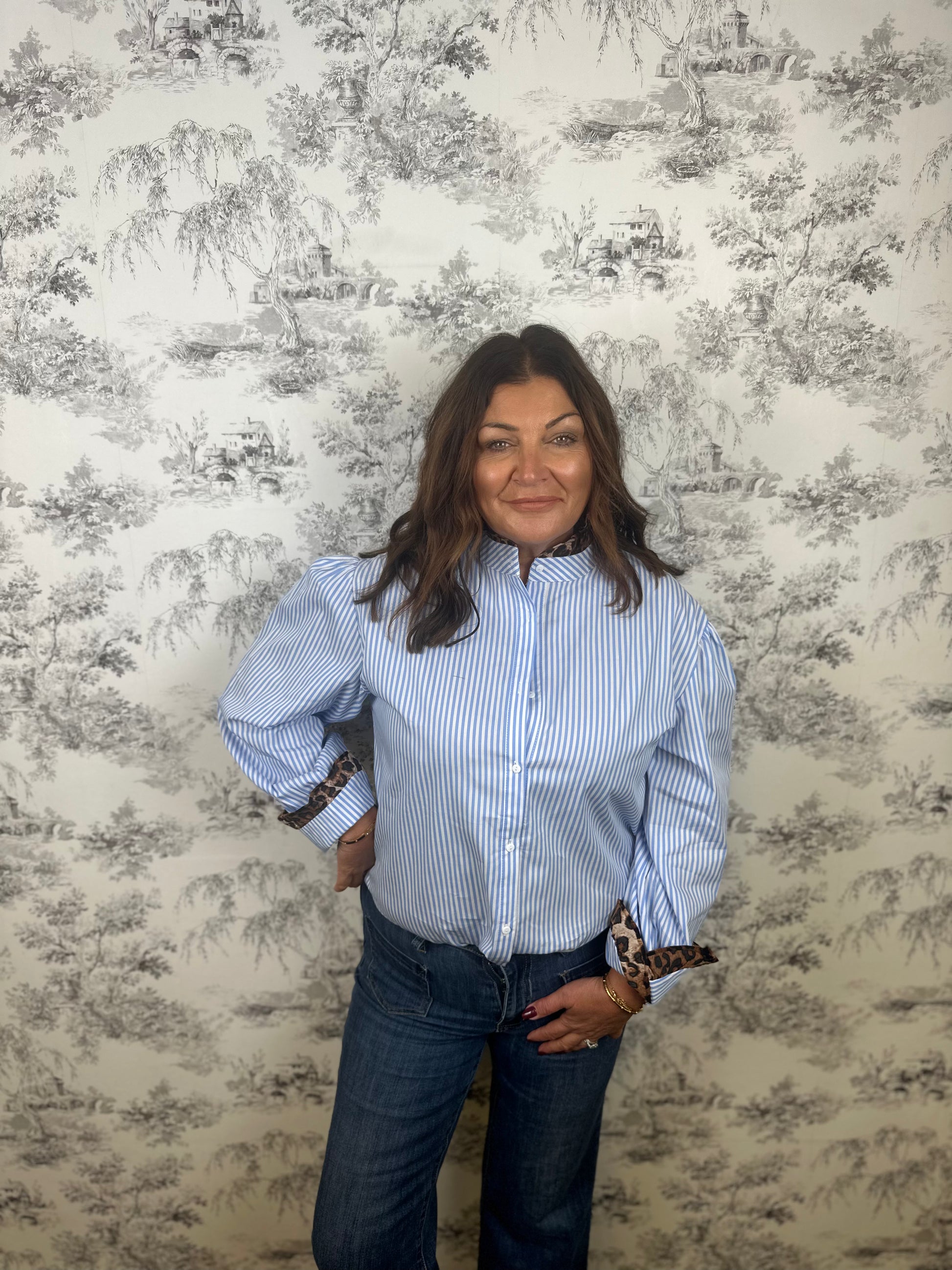 Introducing the Verity Shirt, a modern and stylish addition to your wardrobe. With a classic striped pattern in white and blue, this shirt features unique leopard detailing on the wrists and collar. Available in a range of sizes, including small-medium and large- extra large. Elevate your look with the Verity Shirt.