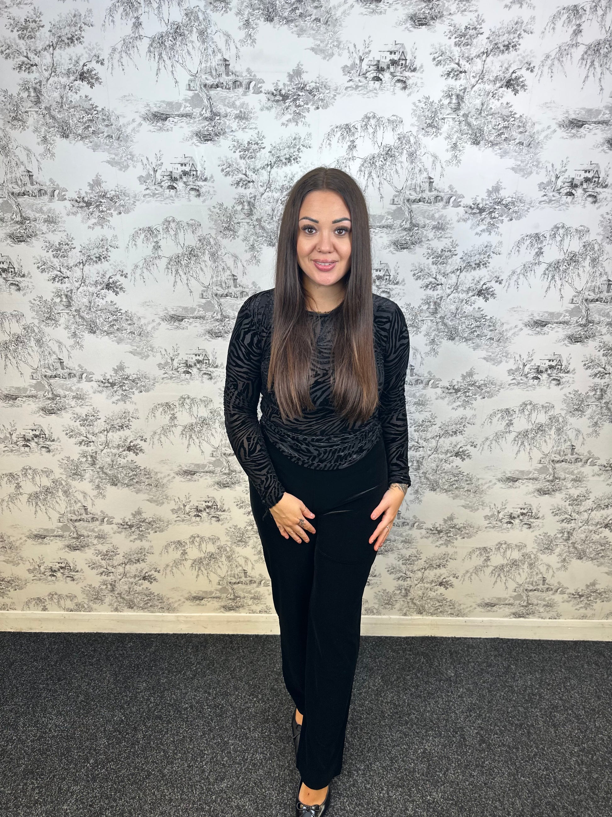 The Zebby top features a unique zebra print on sheer material, with solid black zebra stripes. This top is perfect for adding a bold and stylish touch to any outfit, making a statement while also keeping you cool and comfortable. Stand out from the crowd with the Zebby top.